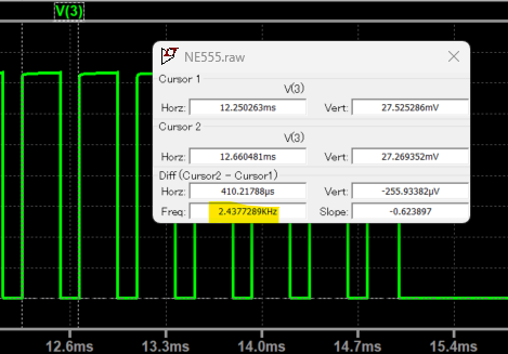 周波数 約2.438kHz(Electrodoc Proの計算値2.404kHz)、デューティ比約71%(Electrodoc Proの計算値66.7%)とな。そんなもんか。