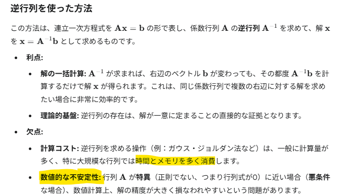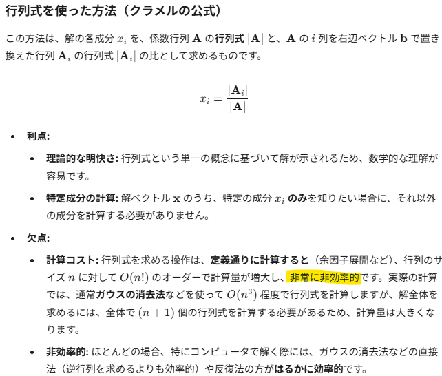 しかし「演習ノート」では、linsolve関数つかってお茶を濁すようなことをせず、ちょうど練習したばかりの「逆行列」とか「行列式(クラメルの公式)」を使って連立方程式を解いてます。演習だからねえ。「演習ノート」に記載されているその方法を追いかけることはいたしませぬ。まあ、実用的にはやらんよな、ということであります。例によってGoogleの生成AI、Gemini 2.5 Flash様にその辺の事情をご説明いただきました。結論が以下に。