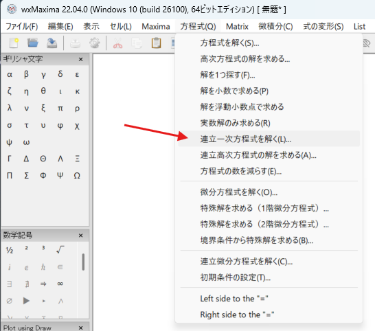 連立一次方程式を解くのはプルダウンメニューから以下の項目を選択です。