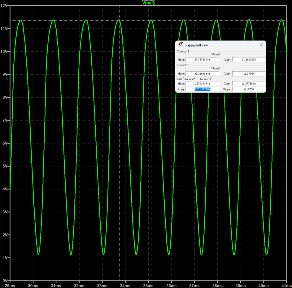 カーソルをあてて、上記グラフから読み取った発振周波数は約725Hzとな。一方、過去回でも使ったRCネットワーク部分の周波数を求める計算式からは約650Hzという値が出てきます。桁はあってるし、まあまあ近い値だからOK。その差を追求せんのか?いつものヘタレだな。
