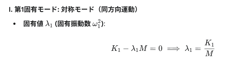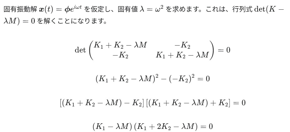 その時の固有値(固有振動数の二乗)は、K1とMを使って以下のようであるみたい。