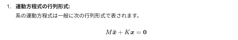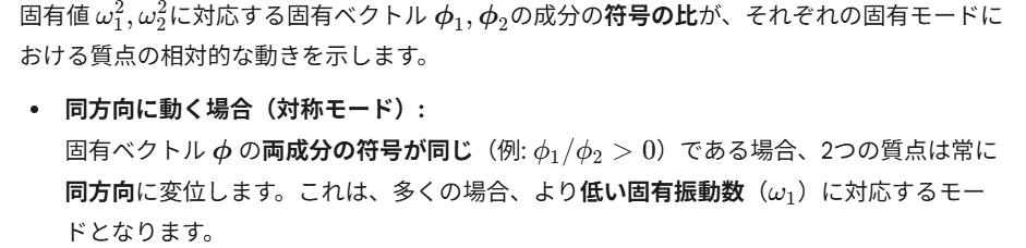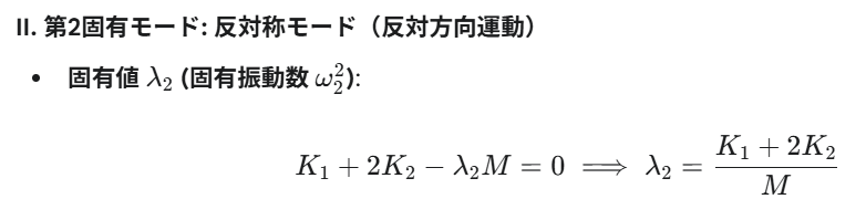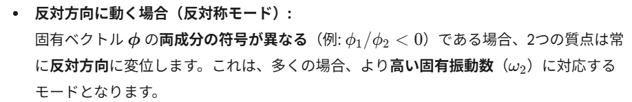 x 軸上を運動する質量M1およびM2の位置をx1(t)、x2(t)とする。左壁に固定されたバネ定数K1のバネがM1に接続されており、右壁に固定されたバネ定数K1のバネがM2に接続されている。さらにM1とM2の間にバネ定数K2のバネが接続されているとき、2質点が反対方向に動く場合と同方向に動く場合の条件を固有値を使って説明してください。
