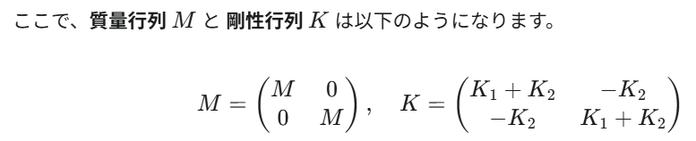 さらに、MとKは以下のようです。なお、質点M1も質点M2も同じ質量Mを持つということになってるみたい。