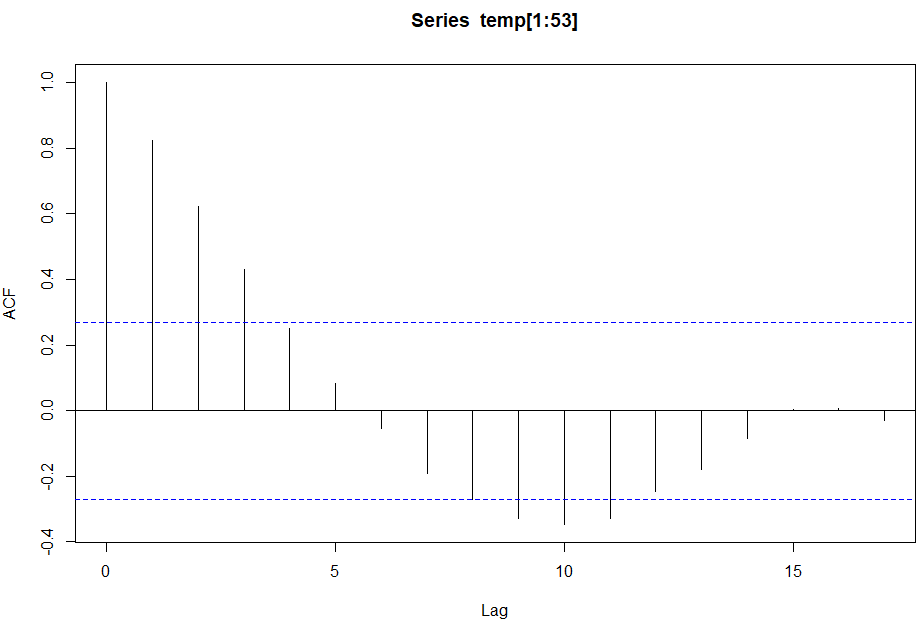 さて、ここからは過去回の処理ではなかった部分です。まずは体温(temp)について、自己相関関数(Autocorrelation Function: ACF)、コレログラムというみたい、を求めてます。