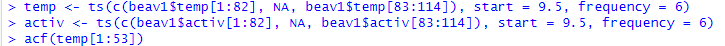 上記のMASSパッケージ内のbeav1とbeav2に対する解説ページには、それぞれ異なる処理例が例示されてます。 beav1についてみると、時系列プロット(過去回と似ているが表現方法異なる)に加えて、自己相関などとって解析してます。beav2はまた別処理。