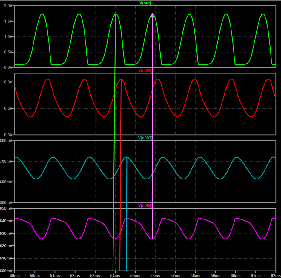 さて上記の回路のシミュレーション結果が以下にまずはシミュレーションの全体像。ここで各プロットの配色が上記回路に書き加えた矢印の配色と合わせてあります。PhaseShift2Sim