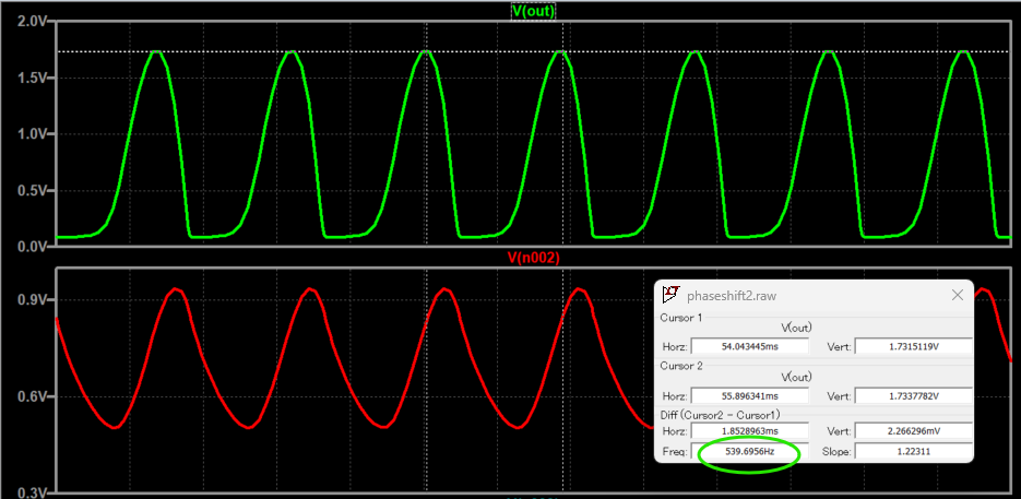ついでにカーソルあてて発振周波数を読み取ってみました。PhaseShift2SimZoomFreq