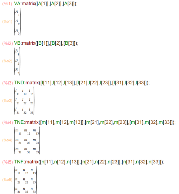 「演習ノート」の例題(ただし変数名などは当方流儀に付け替えさせていただいたもの)による1階テンソル(ベクトル)と2階テンソル(行列)の表現。