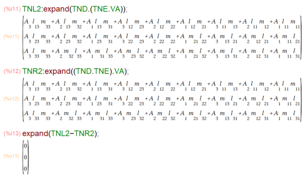 今回、「演習ノート」でお教えいただいているのは、「2階のテンソル」や「1階のテンソル」がここまで行列を表すのに使ってきたMaximaのMatrix記法で、行列やベクトル同様に記すことができる、ということで良いみたいです。そしてテンソルの演算に踏み込みます。4.2.8 では「テンソル演算」といいつつ、テンソルの内積(縮約)の計算だけみたいです。テンソル演算というと「テンソル積」が登場するハズですが、今回はいらっしゃらないみたい。よかった。
