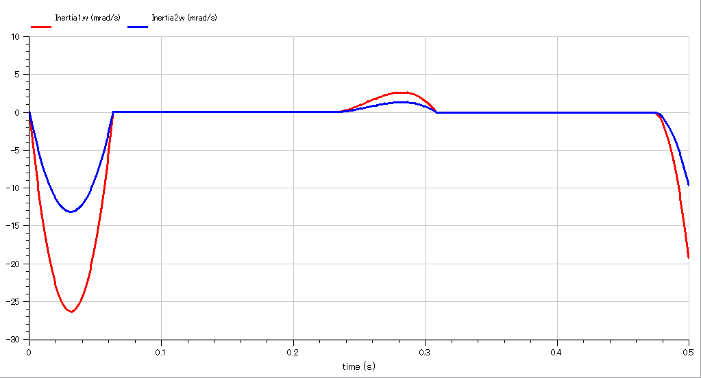 まずは、イナーシャ2個の角速度のプロットです。赤がイナーシャ1、青がイナーシャ2。この波形は前回の波形と「似た」形です。ただし、「ことさらな」ベアリング摩擦の追加により前回よりも遅くなってないかい?