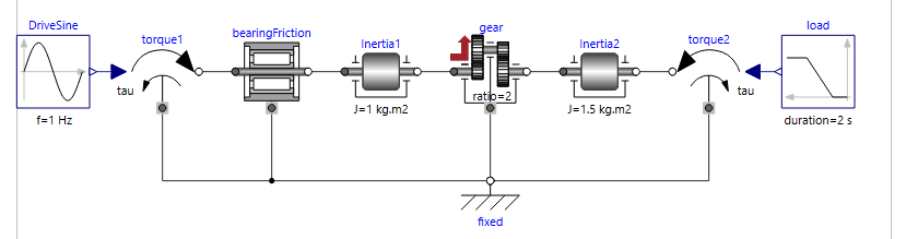 上記を選択すると現れるダイアグラムが以下に。老眼の老人には前回のLossyGearDemo1とほとんど一緒に見えます。よく見れば唯一の違いは、左の方に bearingFrictionなるコンポーネントが存在していること。
