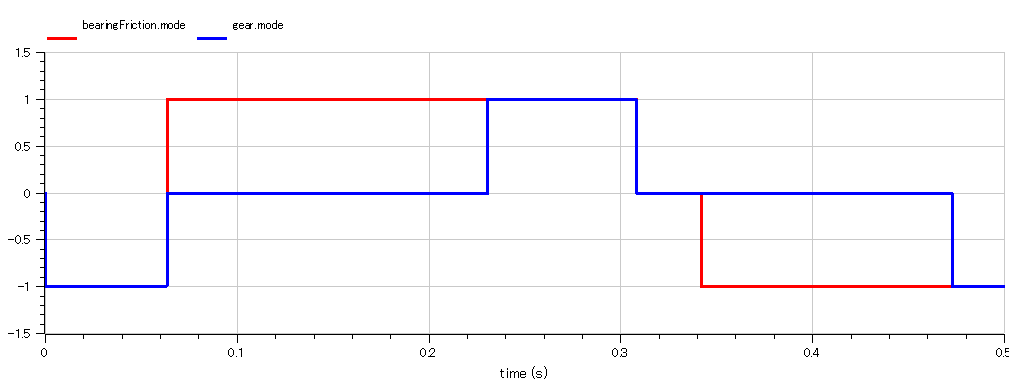 さて、ベアリングとギアの回転モード(1:順方向、0:固着、ー1:逆方向)の変化の様子が以下に。上のプロットからは「似たような動き」をしているようにみえるベアリングとギアだけれども、固着しているところの条件が異なるので、一致はしておらんようです。ムツカシー。