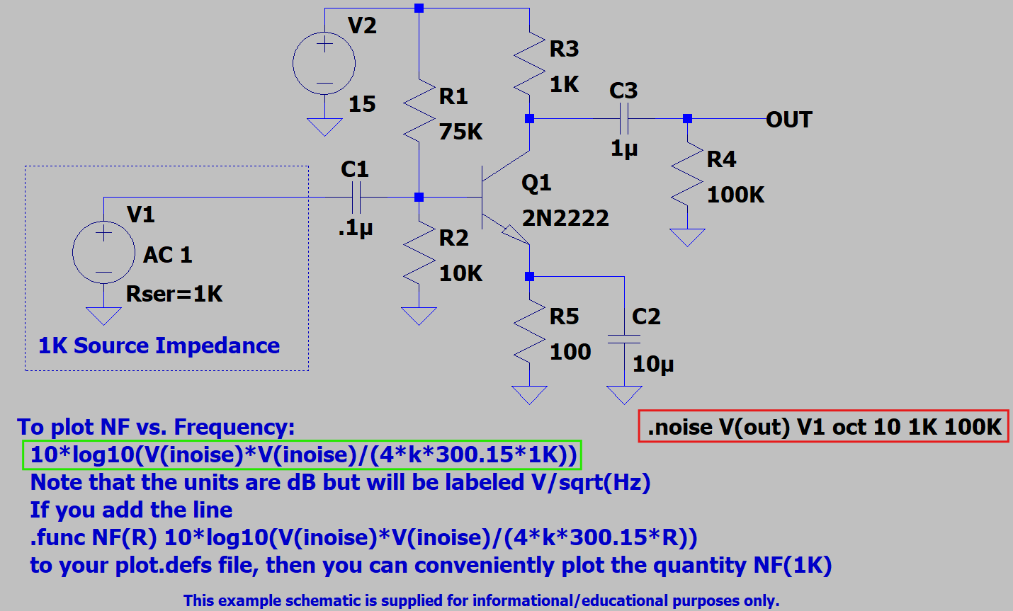 回路そのものはNPNトランジスタ2N2222を使ったアンプのようです。回路そのものはフツー? ノイズ解析のためのAC入力信号を与えている電圧源V1には直列ソース抵抗Rser(1kΩ)が接続されており、こいつの熱雑音が入力ノイズの基準になっているみたい。後でもこの1kが計算の中に登場。