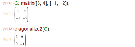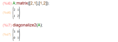 上記の関数定義をバッチ実行すれば、関数どもが使えるようになります。まずは過去回の2x2行列を対角化する例。