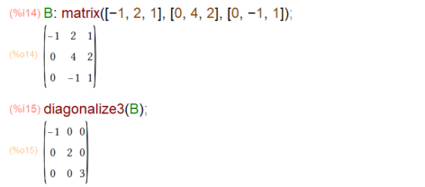「中途半端」の理由の一つは、渡される行列が対角化できるかどうかなどまったくチェックせずに、ただただ決められたシーケンスで処理しているところです。よって、上記の関数どもを呼び出す前に、対角化できる行列なのか否かは自分でチェックしてからにする必要があります。まあ、今回みたいに対角化の練習問題なら対角化できるに決まってますけど。