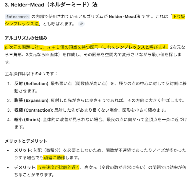 Gemini様がお教えくださったネルダーミード法のおおまかなところが以下に。