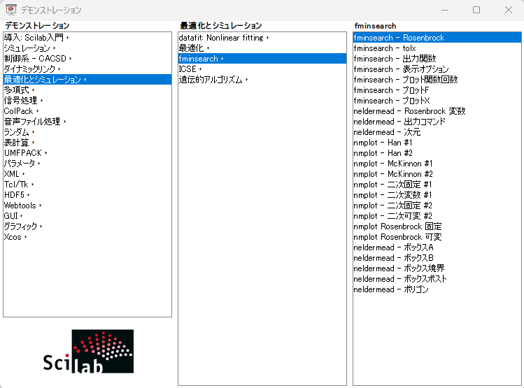 今回「鑑賞」させていただくScilabのデモは、fminsearch_rosenbrock.sceです。以下のデモ選択画面から起動できます。