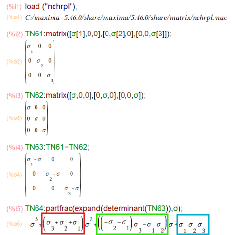Maximaさまにお願いして、演習ノートの足跡をたどりましたものが以下に。なお nchrplは mattrace、ncharpoly関数が定義されているパッケージです。過去回で調べたところでは「泣く子も黙るMACSYMA様」のCHARPOLYという関数と同等のもの(ncharpoly)をMaxima上でも欲しいということで設けられたパッケージみたいデス。