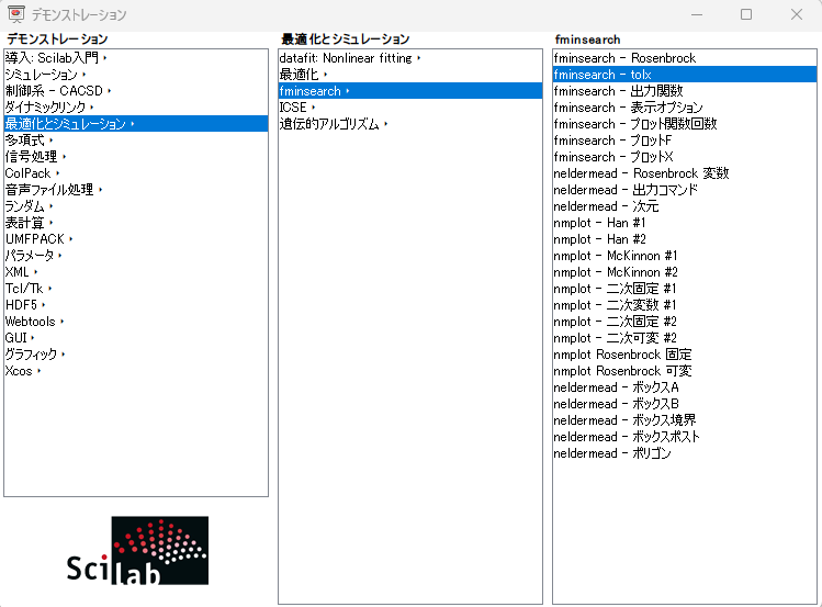 今回「鑑賞」させていただくScilabのデモは、fminsearch_tolx.sce です。以下のデモ選択画面から起動できます。