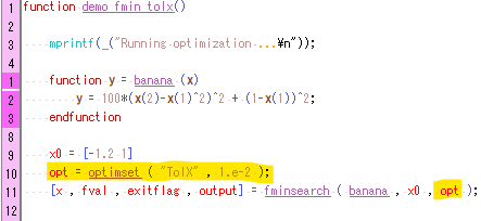 です。Scilabのfminsearch関数のHelpファイル的には、options.TolXなるパラメータの操作です。「シンプレックス(単体)」サイズの絶対誤差みたいです。前回は何も指定しなかったのでデフォルトの 1e-4が使われておったと。今回のコードをみやればこんな感じ。