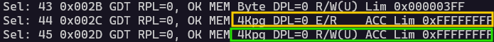 なお、44番目(0x2C)、45番目(0x2D)には前回までのぞき見していたカレントのコード・セグメント(黄枠)とデータ/スタック共用のセグメント(緑枠)が鎮座してます。