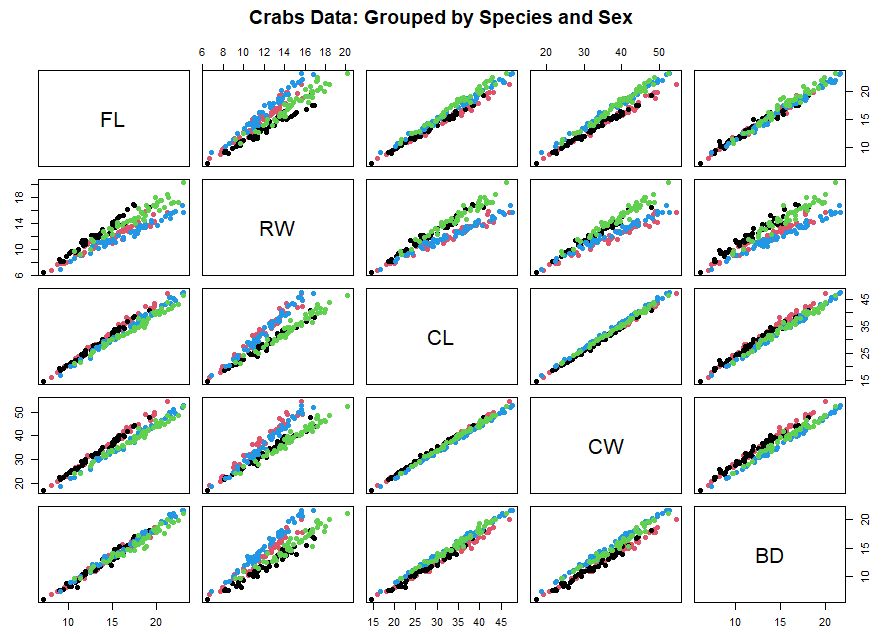 group <- paste(crabs$sp, crabs$sex, sep = "-") grf <- as.factor(group) pairs(crabs[, 4:8], col = grf, pch = 19, main = "Crabs Data: Grouped by Species and Sex")