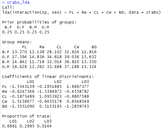 crabs_lda <- lda(interaction(sp, sex) ~ FL + RW + CL + CW + BD, data = crabs)