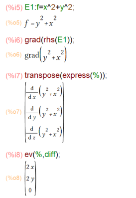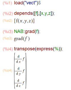 上記過去回では、Mathematicaならキー入力でナブラ演算子(grad)登場し、即座にベクタを与えて計算していけるのでお楽。一方Maximaでは、外部パッケージをload(vect)すると grad関数が使えるようになりますが、呼び出し方がクセ強でした。
