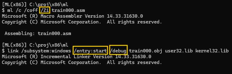 ml /c /coff /Zi train000.asm