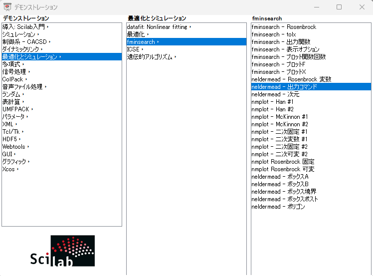 手習ひデジタル信号処理(218) Scilab、{Scilabデモ}、neldermead群 へ戻る