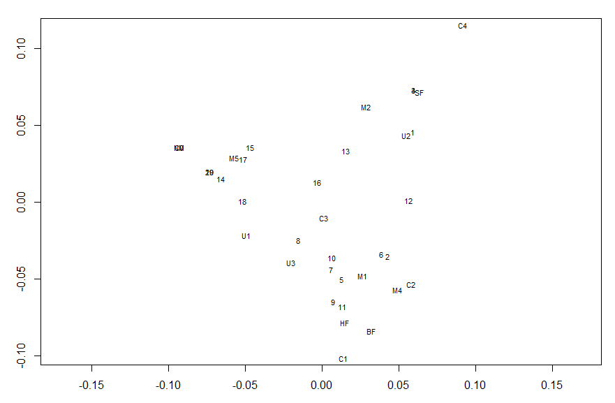 farms.mca <- mca(farms, abbrev = TRUE) eqscplot(farms.mca$cs, type = "n") text(farms.mca$rs, cex = 0.7) text(farms.mca$cs, labels = dimnames(farms.mca$cs)[[1]], cex = 0.7)