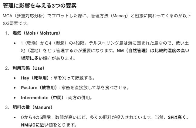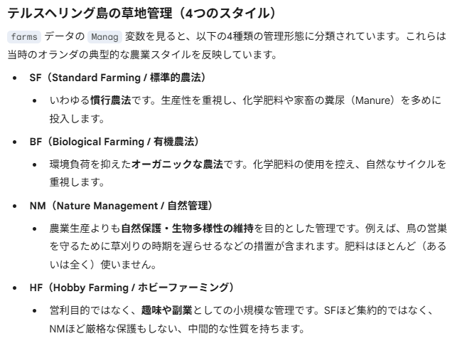 - Manag、草地管理タイプ、4タイプ(SF=標準、 BF=生物的、HF=趣味農業、 NM=自然保護)。その意味するところは後で生成AI様に教えてもらうっと。