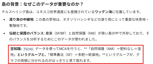 現在R言語の「MASS」パッケージのサンプル・データ・セットを巡回中。今回のデータセットはオランダでのデータです。北海に面したテルスヘリング島という島の牧草地というか草地の管理について、MCA(多重対応分析)を行うものみたいです。例によって素人老人にはサッパリっす。でも生成AI様はオランダの島のこともよーく御存じ。