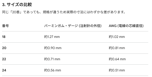「似ている」けれども、ビミョーに違うね。でも電線のAWG呼びが分かっていたら(そんなもの分かっているのは電線屋さんとオタクのみ?)、注射針の太さも大体分かるっと。