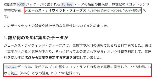 R言語の「MASS」パッケージのサンプル・データ・セットを巡回中。Forbesと言えば米国の雑誌が有名。当方も日本語版のWeb記事など時々読ませていただいてます、あざ~す。しかし今回のForbesは19世紀、スコットランドの学者様です。先生が「やらかし」たお陰で統計の定番データになってしまったみたい。