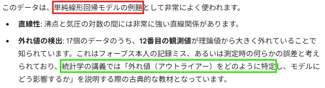 なんでもよくご存じのGemini様です。このハズレ値が「どのくらい」ハズレものなのか解析する方法を示してくださいました。その際、元の(華氏、インチHgの)forbesデータに対し、