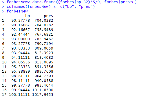 forbesNew<-data.frame((forbes$bp-32)*5/9, forbes$pres*C)
